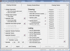 In the absolute FREE shareware version almost all functions are available. The import from data, the data report to MS-Word as well the external storage from data is not possible. Moreover besides our example tournament you can only manage one own event and on the prints is our Shareware-Watermark.